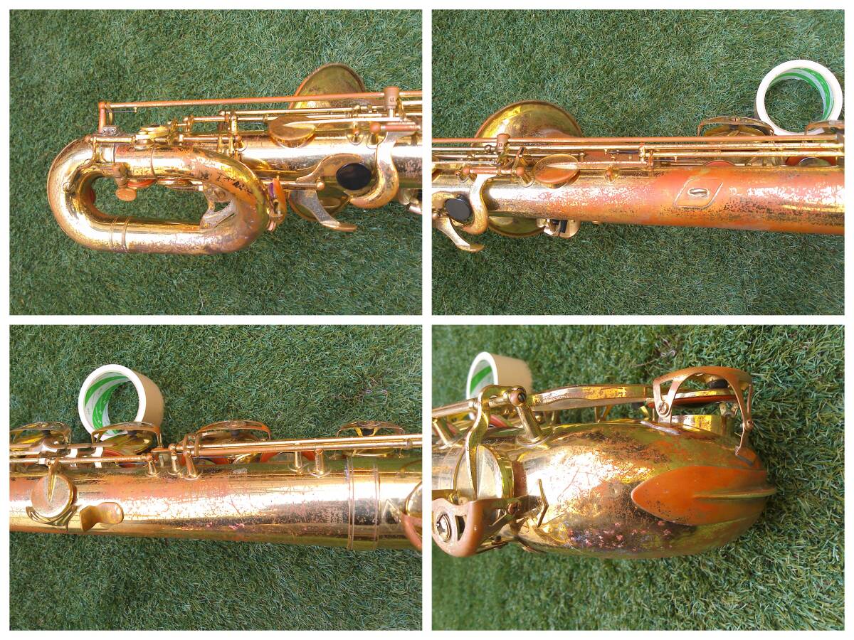 ●はじめに 私どもは、「インボイス制度」上は免税事業者ですので、適格請求書・領収書の発行は出来ません。 加えて、自己紹介の記載内容もご覧頂き、ご理解頂いた上で入札をご検討下さい。 入札につきましては、写真がすべてですので(除く、撮影の際に写り込んでしまった商品と関係ないものなど)写真でご判断下さい。但し、写真の色につきましては、私どもの撮影環境、また、ご覧いただいている方々の端末環境(PC、タブレット、スマホなど)に因っても実物とは違った色に見えてしまうことも有ると思います。出品の際に私どものPCでもあまりにも色が可笑しい場合は再撮影する様にしておりますが、いずれにしましても色が気になる方は、店頭で販売されている実物をご覧になり購入するに越したことは無いと思います。 その他、ご不明な点などが有りましたらご質問下さい。 なお、本出品と並行して知合いに限定し、直接交渉も行っております関係上、知合いから購入の意思が示された時点において、何方からも入札が無かった場合は出品を取り消す場合が御座います。 ●3N前提でのお取引です(キャンセル、クレーム及び返品はお受け出来ません) (3N:No Cancel, No Claim, No Return) 私どもは、出荷前点検を入念に行い、輸送中の振動等を考慮して梱包し、発送しております。決していい加減な状態(=演奏に支障有り)の商品を発送する様なことは致しません。 従いまして、返品に関しましては”すり替え防止”等からお受け致しませんが、配送中のトラブル発生につきましては、当オークションヘルプにて「配送中のトラブルについて」を検索頂きますと、対処方法(制度上、落札者からのみの申請)が案内されています。 加えてノーキャンセル・ノークレームにも御同意頂ける方のみ、入札をお願い致します。 なお、評価数の少ない方、「悪い」の評価が有る方などは、当方の判断で入札を取り消す場合が御座います。 ●商品の概要説明 本品は古いモデルながら未だに人気の高いYAMAHAのバリトンサックス、YBS-41です。某有名サイトの掲載情報を引用させて頂きますと「鳴りの良さは定評があり、62より41を選ぶプロ奏者もいるほど」とのことです。私自身もかなりの数のYBS-41を整備し、試奏して来ましたが、「41を選ぶプロ奏者もいるほど」という点に完全に同意しております。私の具体的な感想としては、”鳴りの良さ”はさることながら、”音の締まり”も良く、最近のバリサクの設計とも似たようなものなので、大変コスパの良い楽器だと思います。 YBS-41の最近の相場を調査して見ますと、未整備、若しくは最低限の調整を行った状態のものが(欠品が多くボロボロの状態で無ければ)、22万円前後で取引されている様です。 本品は、全タンポ交換を含め、一般的なオーバーホール(OH)のリペア項目の他に私のこだわりによるリペア項目を含めてバッチリと整備したものです(私どもの造語で恐縮ですが、「こだわりOH実施済み」です)。一般的なOHの相場は15万円程度で、更に凹みの修正とか、後述しますこだわりリペア項目まで整備すると数万円プラスとなり、単純計算ですと総額が”かなりの高額”となってしまいますが、サックスライフを愛する方々向けに、私どものボランティア精神を反映し、お買い得な即決価格を設定させて頂きました。 ラッカーの剥がれ、錆は多いですが(青錆は健康に良く無い様ですので極力除去)、目立っていた大きな凹みは修正してあり(小さい凹みは残ってますが)、何より全タンポ交換を含めキチンとOH(含む、キーのガタの最小化+バッチリとしたバランス調整などの”こだわりリペア項目)を済ませて有りますので、安心してご利用頂ける即戦力状態のジャパンビンテージ・バリサクです。 この機会に是非、入札をご検討頂ければ幸いです。 次項に詳細な整備内容等を補足説明として記述しますが、本項の概要説明の内容及び次項の補足説明には私の主観などを含みますので、あくまでも参考情報です。落札者様にお届けする現品が優先となります。 ●商品の補足説明 ①本品のシリアルは「26xx」です。表面仕上げのゴールドラッカーの残存率は70%程度だと思います。錆・キズが多いですが、青錆は前記のとおり健康上良く無い様ですので極力除去しました。 ②全体を分解し、洗浄・乾燥後にラッカーポリッシュで磨いてあります。YAMAHAのバリトンサックスは、ネジ止めの胴輪が2箇所(U字・2番管接合部と2・3番管接合部)も分解し、それぞれの管も切り離し、古い接着剤を奇麗に除去し、キチンと再接着して、それぞれの胴輪をネジ固定してあります。 ③凹みは、あちら・こちらに数多く有りましたが、目立つ大きな凹みは修正して有ります。この個体は、珍しくネックの下の”渦巻き管”(3・4番管)の凹みが少なかったので驚きでした。 ④すべてのトーンホール(TH)の先端(タンポと接する部分)をディスク・ヤスリで平面出しを行い、その加工後のバリ取り(面取り)を特殊工具(自作工具)で実施して有