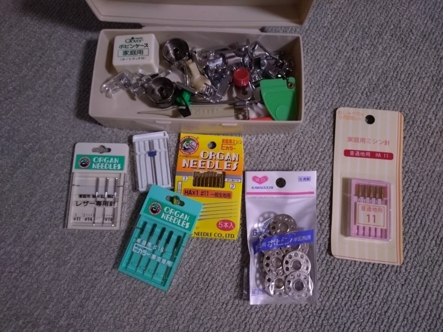 家庭用ミシン針 ボビン・ボビンケース 布押さえ金具いろいろ 用途に関しては詳しくないのでわかりません。 ケースから出せば、ネコポスやゆうぱけっと(230円)が可能です。 |